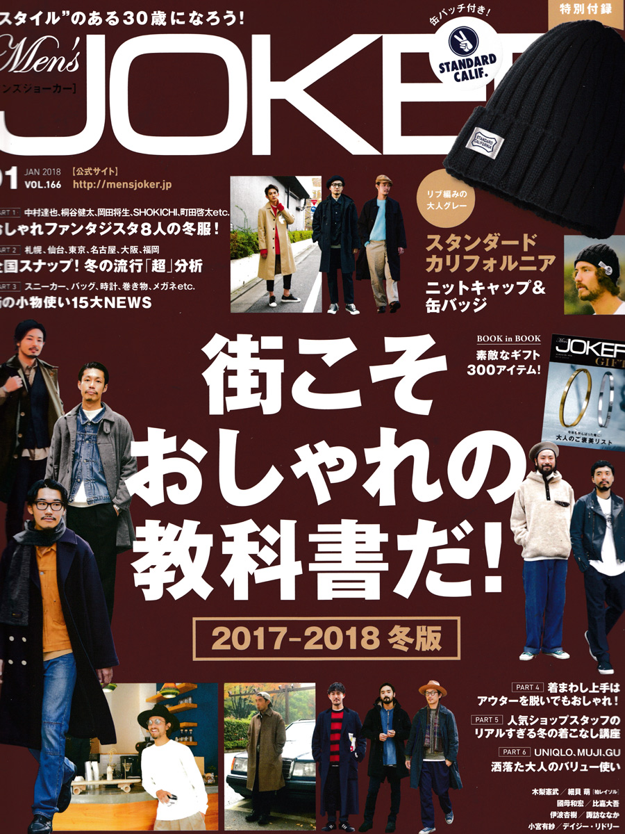 現在、発売中の「Men’sJOKER 1月号」にStandard Californiaのニットキャップ&缶バッジが付録でついてます。