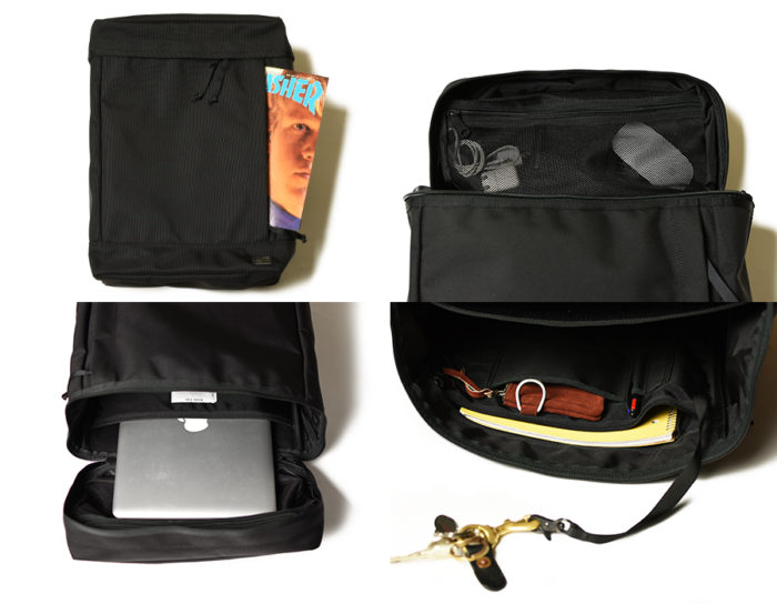 衝撃を吸収するクッション性の高い背裏のPCポケットと、そのPC周りアイテム入れるのにもちょうど良いフタ裏のメッシュポケット。