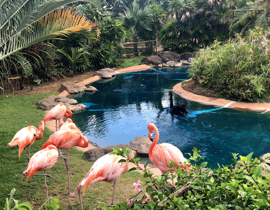 まずは鮮やかな色のフラミンゴとブラックスワンがお出迎え。