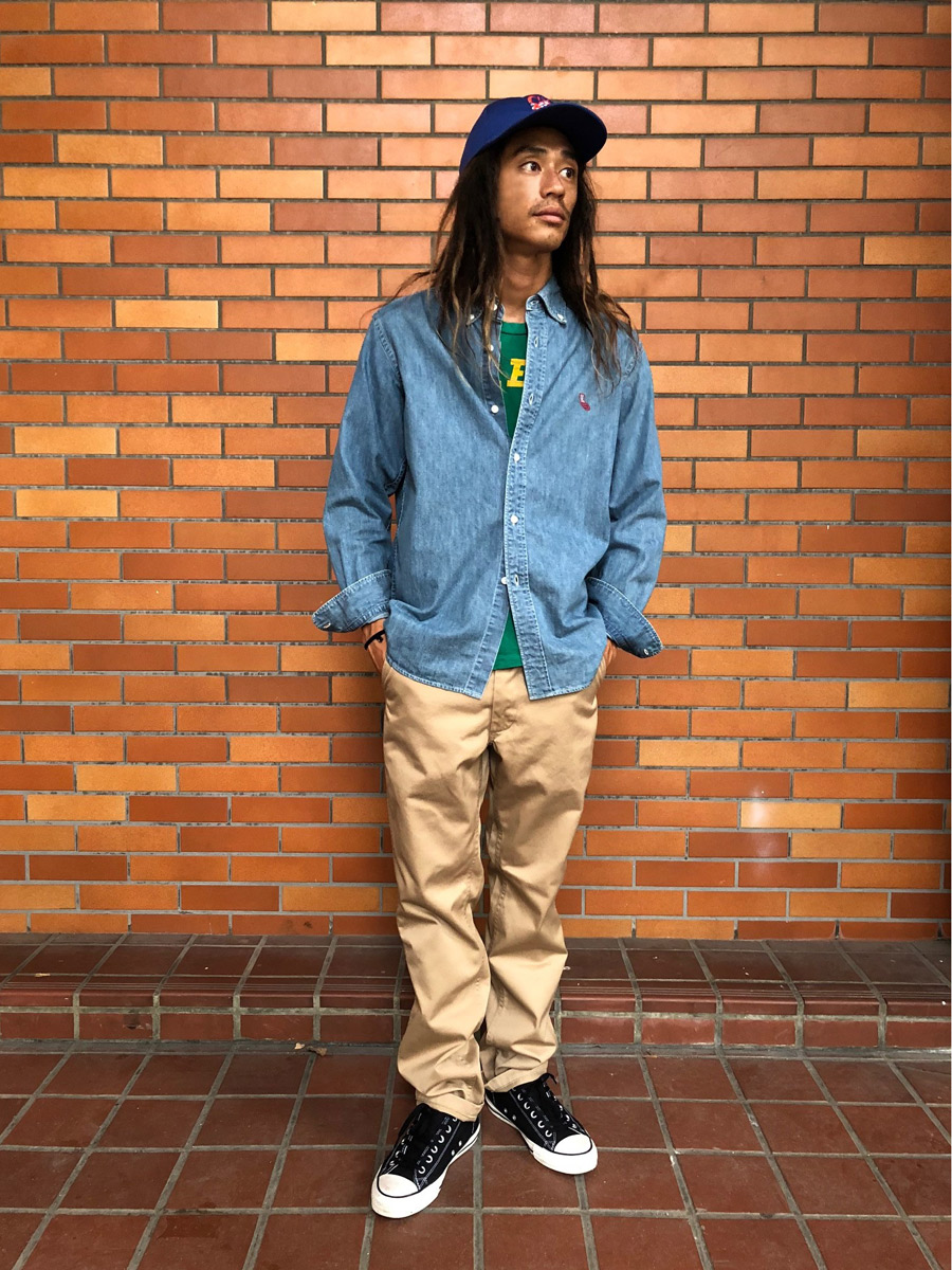 今回はT/Cパンツとキャップでよりカジュアルにコーディネートしてみました。