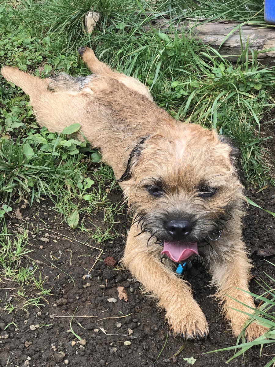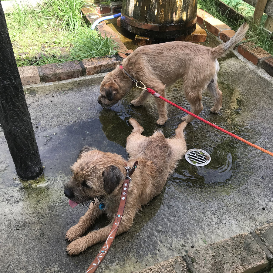 さんざん走り回って泥だらけの後は水溜まりに寝てびっしょり・・・
