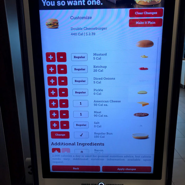 全ての店舗かどうかは分かりませんが、アメリカのマクドナルドはレジとは別にこんなモニターがあってハンバーガーからドリンクまで全てカスタムメイドできます。この機械でカード決済すればテーブルまで運んできてくれてなかなか便利。