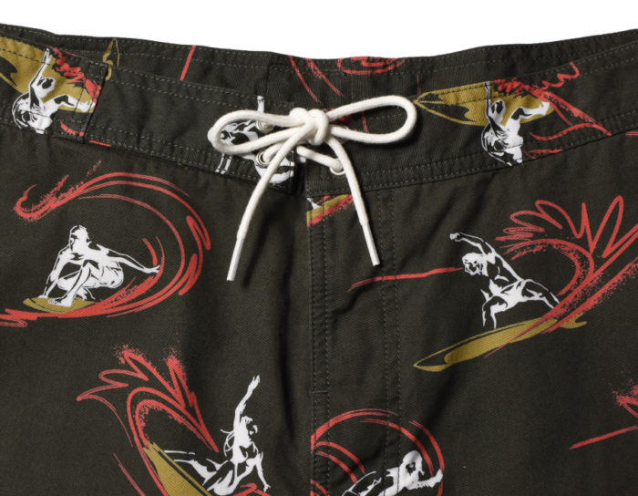 丈夫なウェザー生地にハンドプリントを入れたサーファー柄のサーフショーツ。