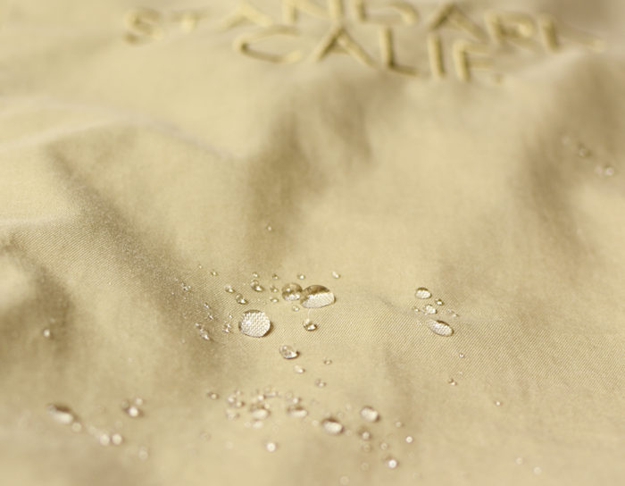 アクリルコーティングの撥水加工がされていて多少の雨なら問題なく、たとえ濡れてもすぐに乾きます。