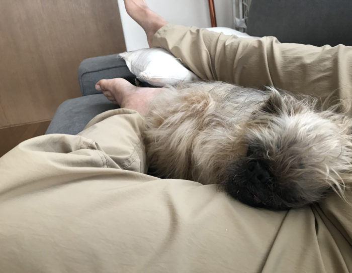 サンバは僕の股間で熟睡。ここはサンバの定位置で通称「4の位置」。