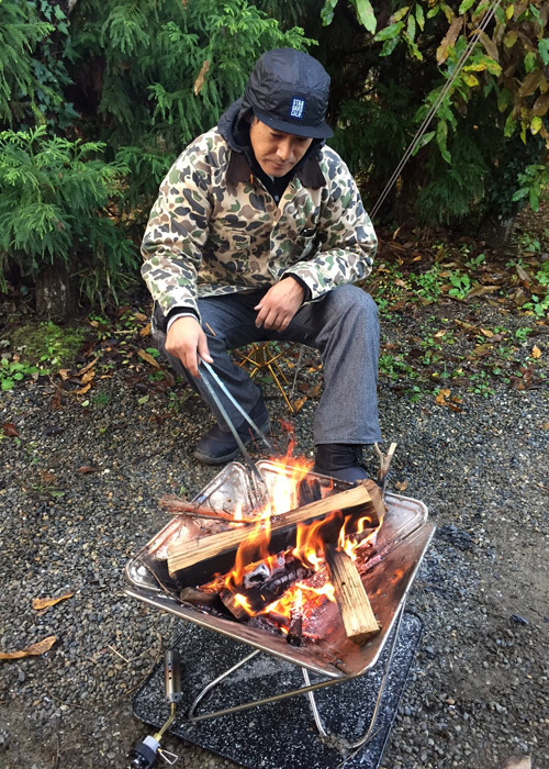 オリジナルのフリースジャケットの上にフィールドジャケットを着れば暖かいし多少の火の粉も大丈夫。