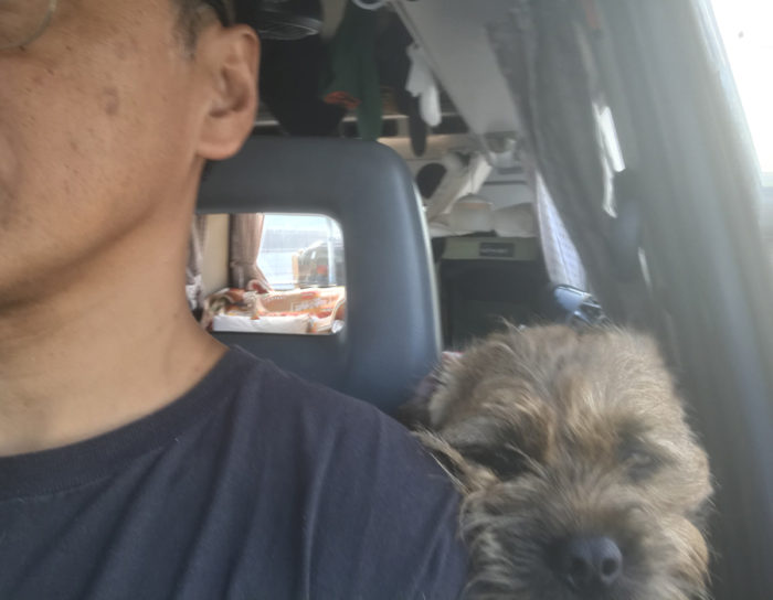 ボーボーは運転しているとこのポジションが好きなようです。可愛いんだけど結構肩がこる。今回は老犬サンバは暑さに負けそうなので実家でお留守番です。