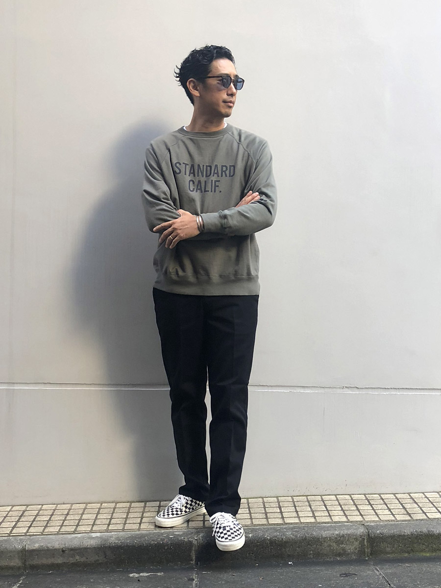 スウェットはLサイズを、TCワークPTは32インチを着用しています。