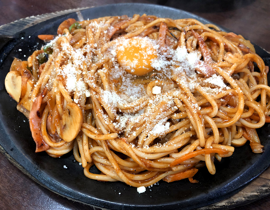 ただ、このイタリアンスパゲッティはアツアツの鉄板の上に乗っていて、卵を絡めていただきます。