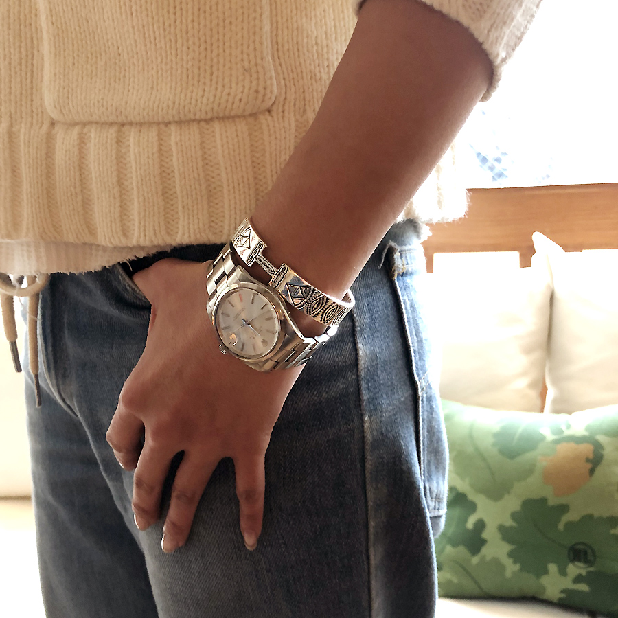 細いバングルやシェーヌダンクルは時計と重ね着け。