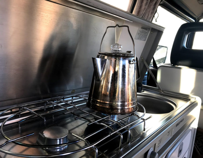 プロパンタンクを取っ払ったのでコンロが使えなってしまう。車内で料理はしませんがお湯を沸かしてコーヒー飲んだりカップラーメン食べるのは至福な時。