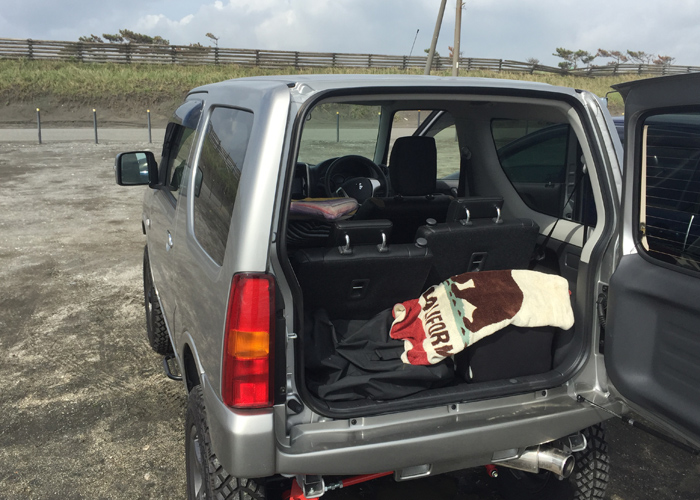 最近乗り出したジムニー。 7ft位までは助手席倒せば入るし、駐車スペース困らないし、砂浜全くハマる心配ないし 一人サーフィンには最高な相棒かも。