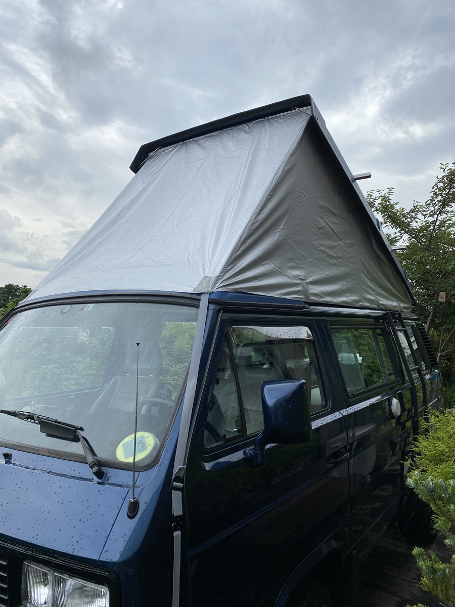 僕のはWESTFALIAのキャンパーなのですがポップアップテントはおそらく91年の新車時からついている物。コットン製なので結露しなくていいのですが雨に濡れると乾かすのが大変。ちょっと前にGOWESTYでRAINFLYを購入してそのままになっていたのでようやくインストールしました。