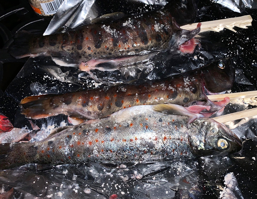日中はロンTで丁度良いぐらいの気温。 紅葉を見ながら最初の目的地の管理釣り場へ。 釣りを満喫したあとはバーベキュー。 釣ったニジマスとアマゴも塩焼きに。 締めは露天風呂。 秋満喫な休日でした。