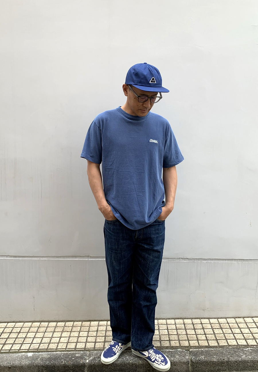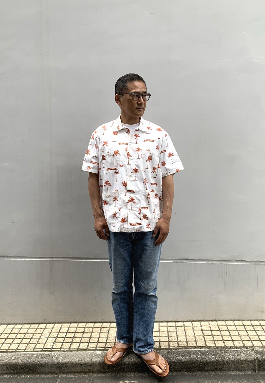 こんな主役級のシャツにはシンプルにデニムとサンダルを合わせたいです。デニムは少し前に販売した905の34インチ。シャツに合せてリラックススタイルで。