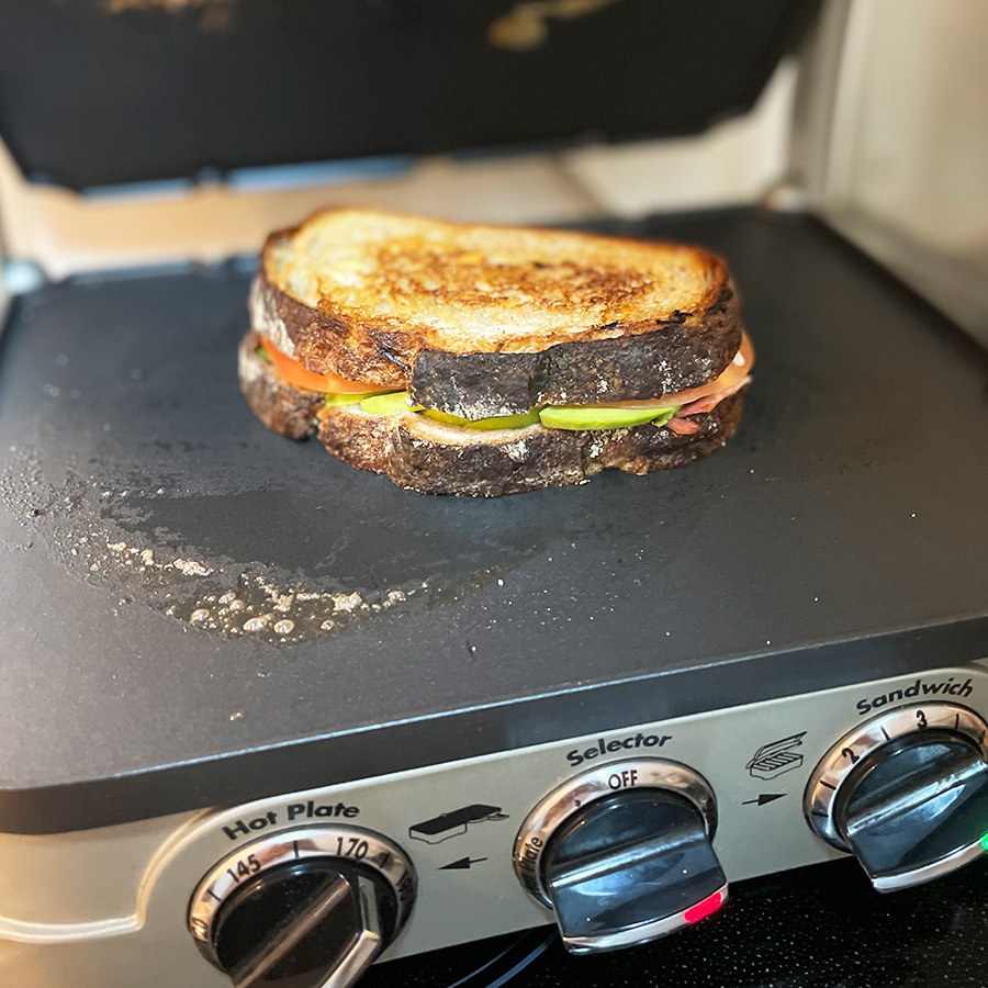 マヨネーズを両面に軽くぬって大好きなシラチャー・ソース をかけてプレス機でしっかりチーズをトロットロにして食べる。