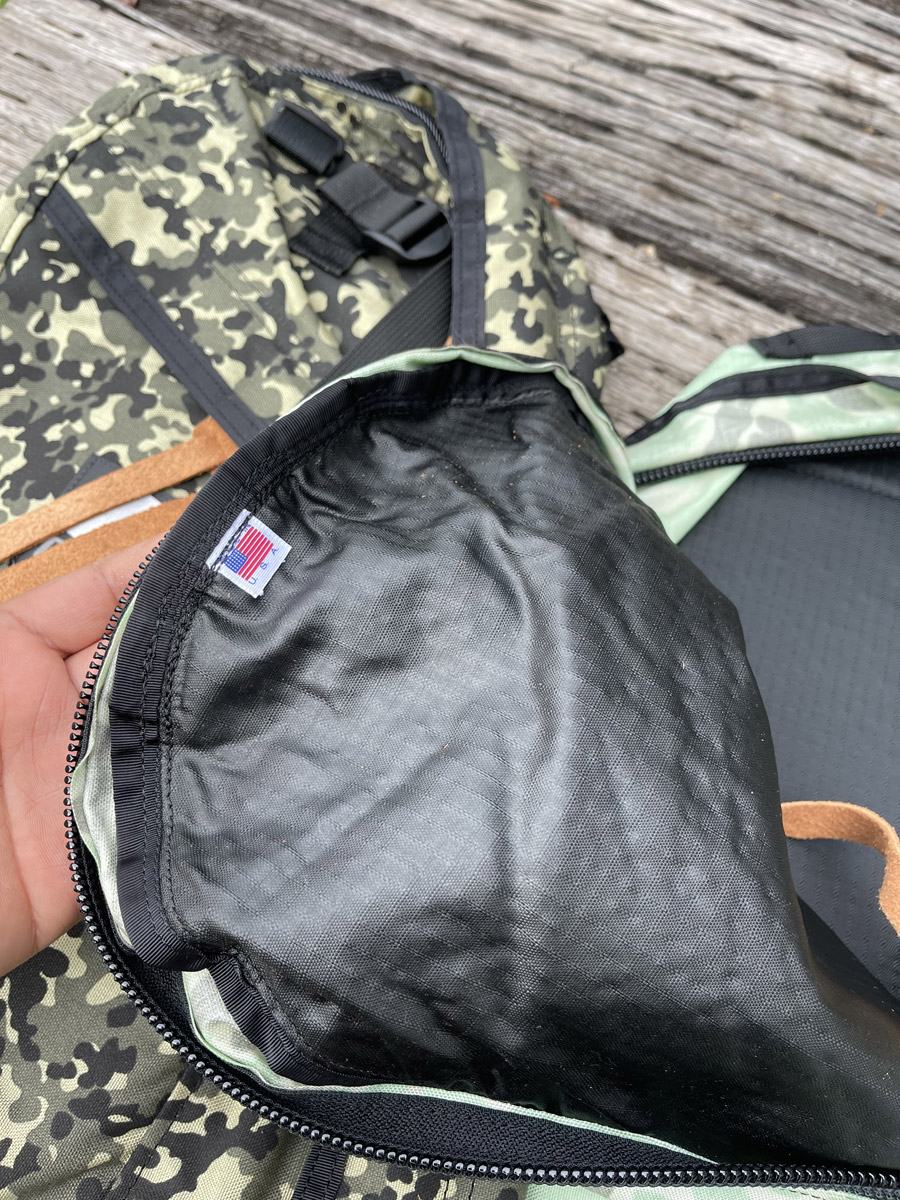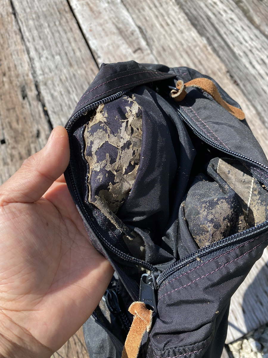 古いウエストバッグは裏地の防水コーティングがパラパラと剥がれてきたので全て剥がします。嫌な匂いやベタベタはこの防水コーティングが劣化しておきるようです。