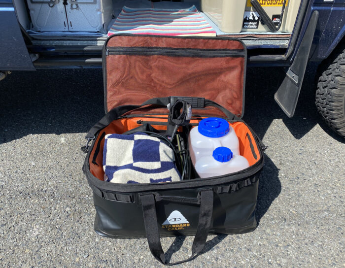 POLeRのコンテナバッグ。 ポリタン、ウエット、リーシュとタオル。一つにまとまって良い感じです。 こんな使い方もありかと。