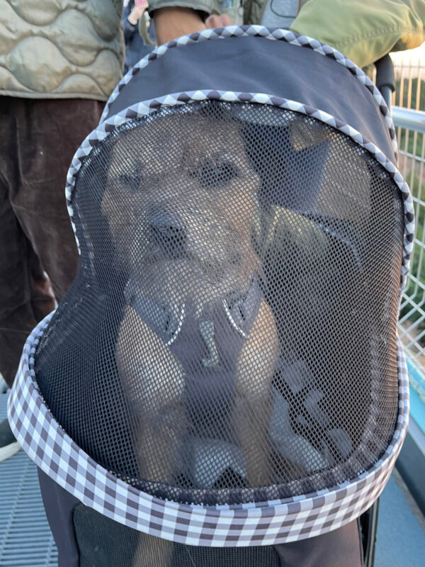 因みに吊り橋を渡る際には犬はこのカートを貸し出しされ、これに乗せないと渡れません。ボーボーのこの顔は怒ってます。サンバはボーボーのお尻の下でお休み中。