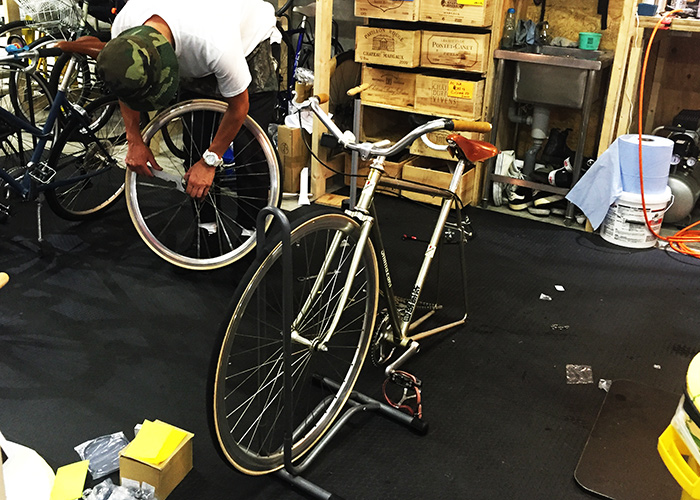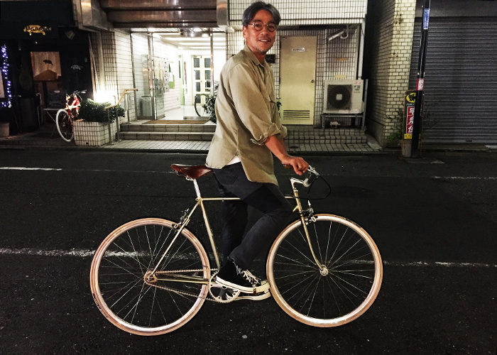 三宅さんの自転車は、Bossの親戚の故佐藤勝彦選手に頂いたフレームをもとに組んだもの。 今回は固定ギヤをフリーに。