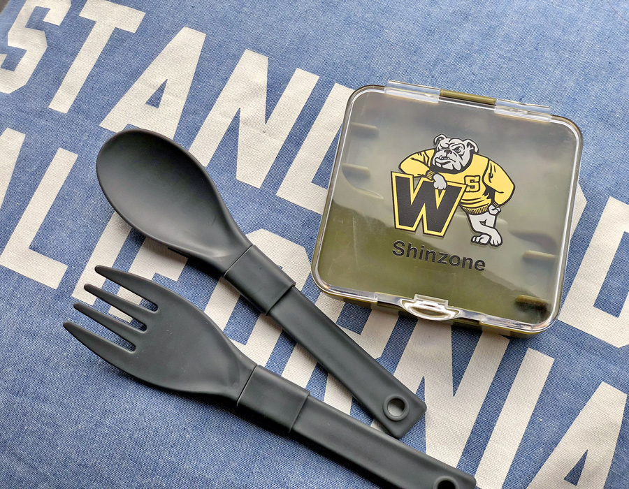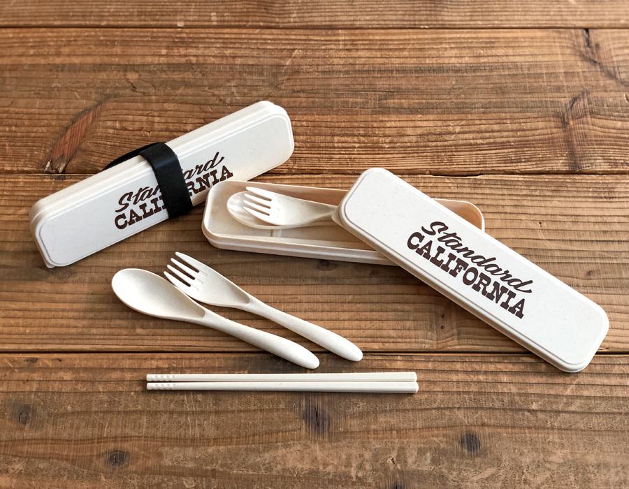 竹の繊維をパウダー状にして固めたバンブーファイバーを混ぜ込むことで、合成樹脂の使用量を減らした環境に優しいアイテム。Standard Californiaのロゴ入りケースにはスプーン、フォーク、お箸の3点セットが収納されています。