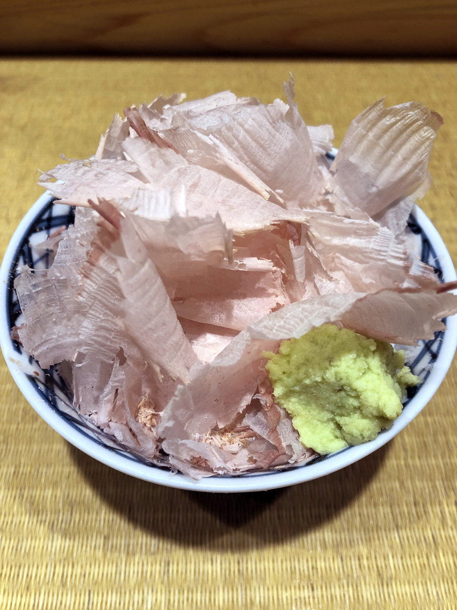 ご飯の上にたっぷりと削り節がのったわさび丼。
