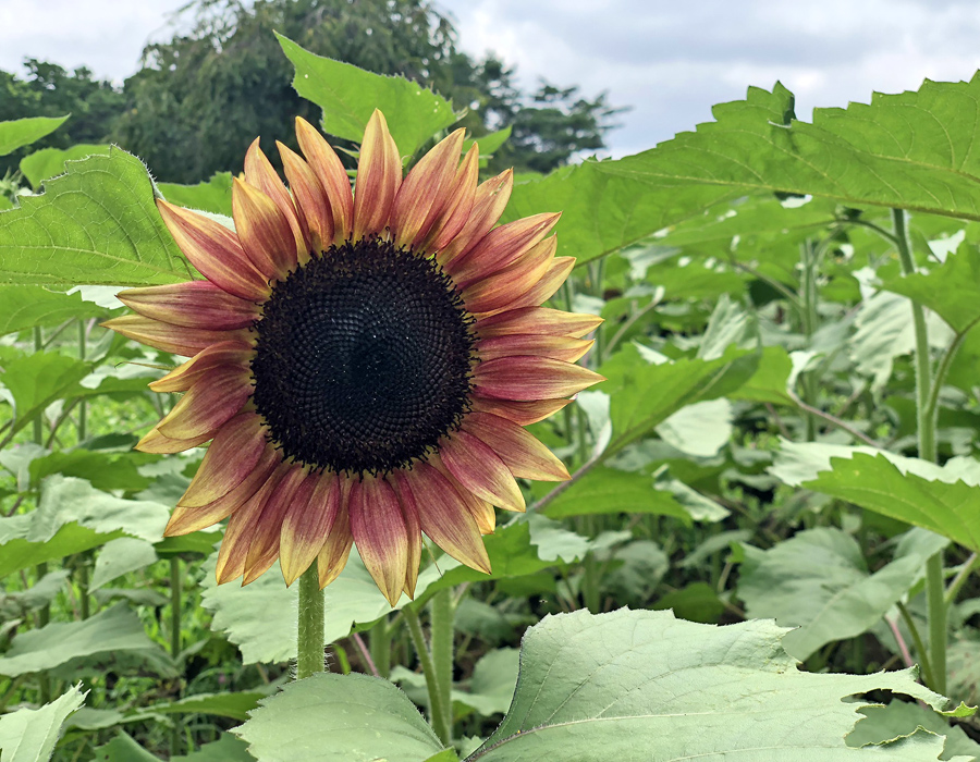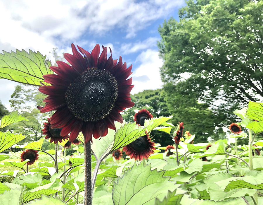 真っ赤に染まる珍しいひまわり。黒みのかかった赤がシックで大人な雰囲気でした。