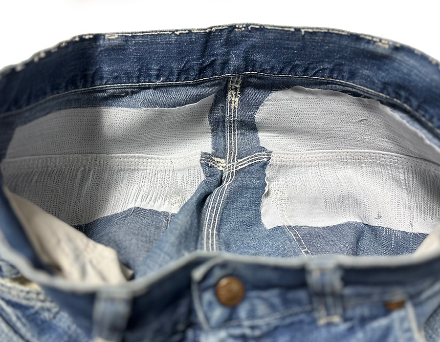 最初はダメージもそんなに無かったのですが、穿いているうちに色々破けてはリペアを繰り返しているうちにこんな状態に。