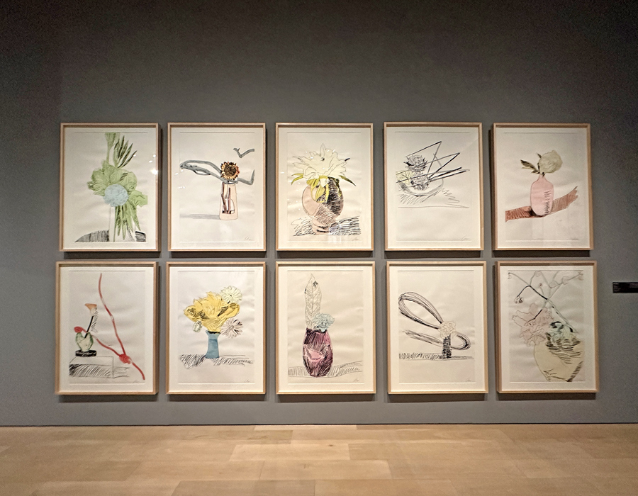上の作品は1974年 二度目の来日の際に立ち寄った京都で触れた文化に感銘を受け描いた手彩色によるスクリーンプリントの生花。