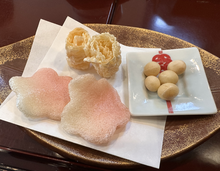 とはいえ、これ以外にも汲み上げ湯葉やよもぎ麩の白味噌仕立て、デザートの麩まんじゅうと盛り沢山。