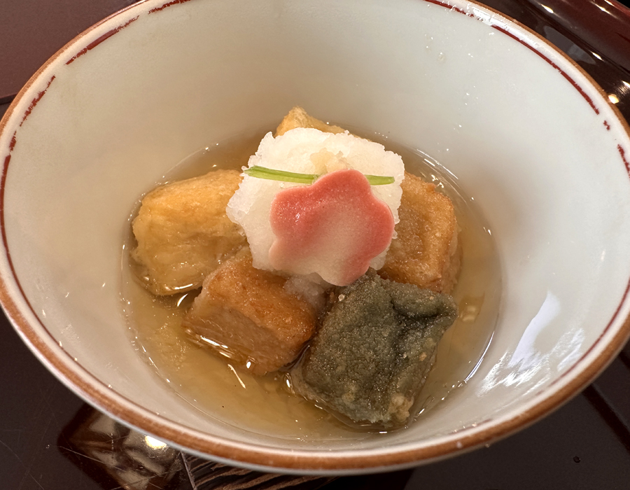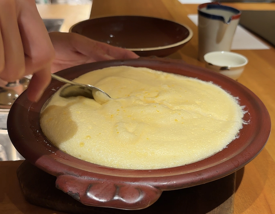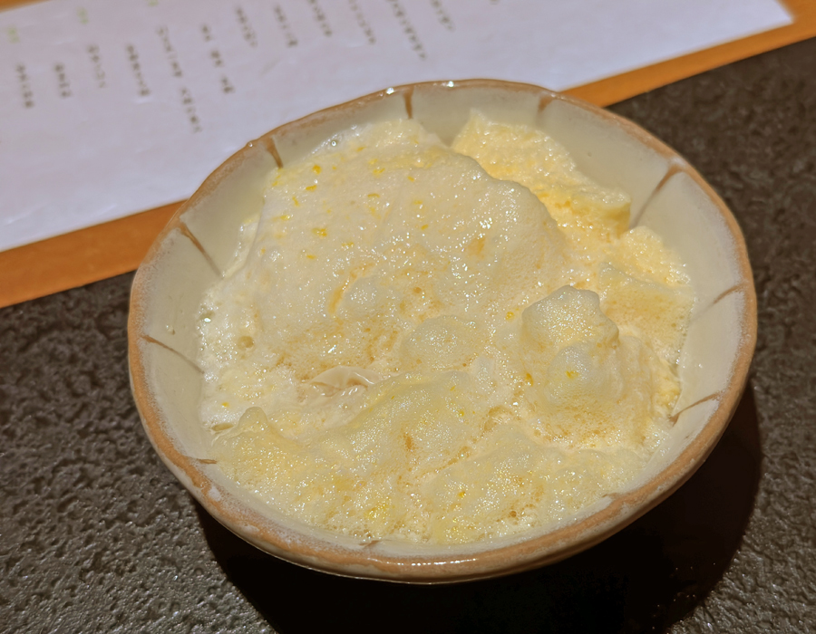 目の前で取り分けて頂いたふわっふわのたまごを湯葉と出汁と共にいただく一品。