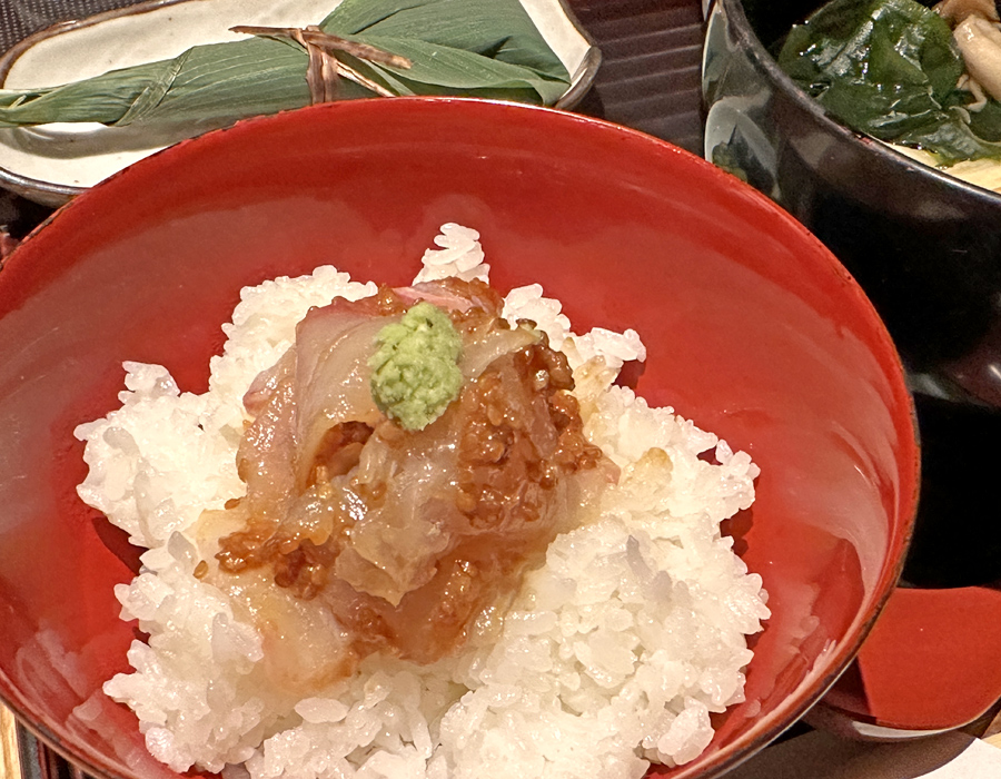 鯛の胡麻味噌丼に人気の和久傳名物れんこん菓子 西湖がついた「はしたてセット」を。