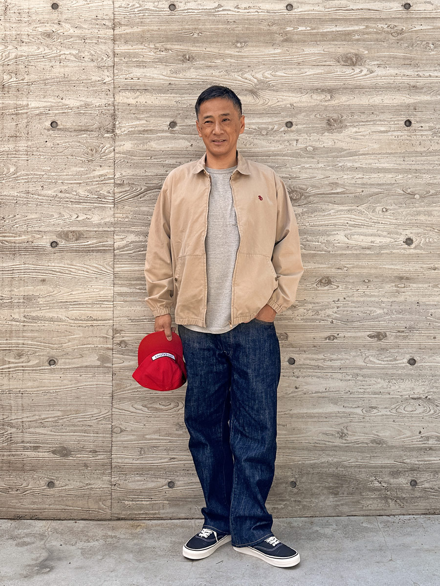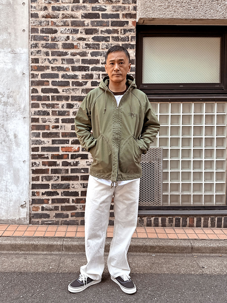 今回は当時の物より軽く、柔らかい起毛感のあるツイルを使用しているのでとても着心地、肌触り良く仕上がっています。これからの季節にTシャツにサラッと着られるし、シンプルなので中にシャツなどを合わせても良い感じだと思います。