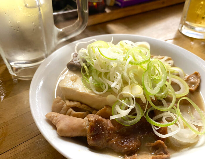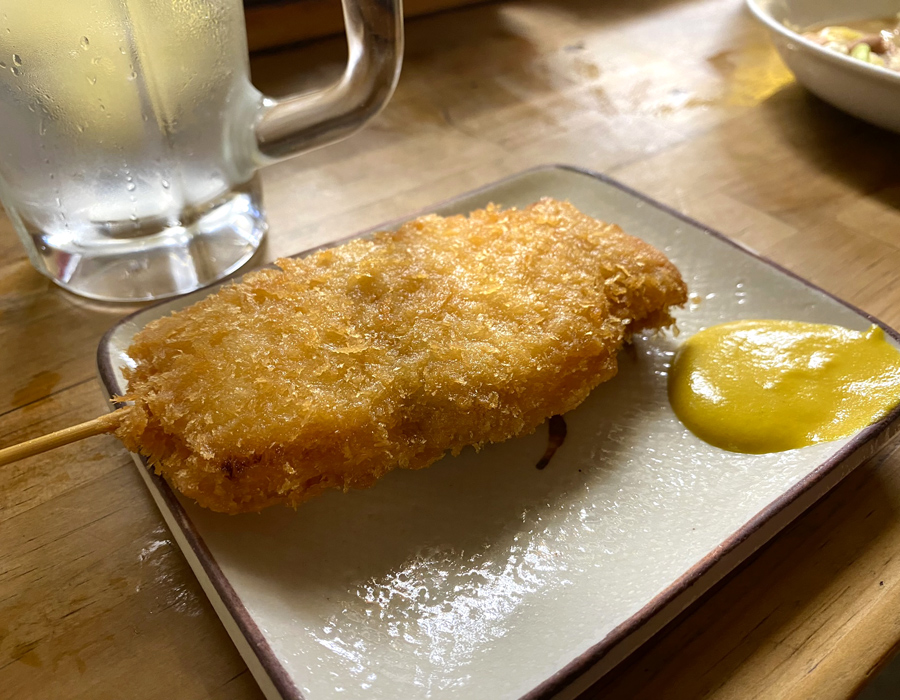 今回食べたのはもつ煮、ジャンボ串カツ、鶏皮ポン酢。写真はないですがその他も・・・