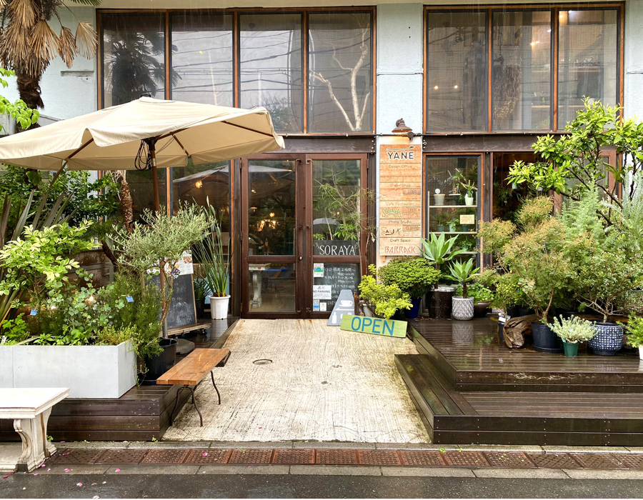 ここはカフェ、グリーンの販売、奥には工房や設計事務所があるといった複合施設。