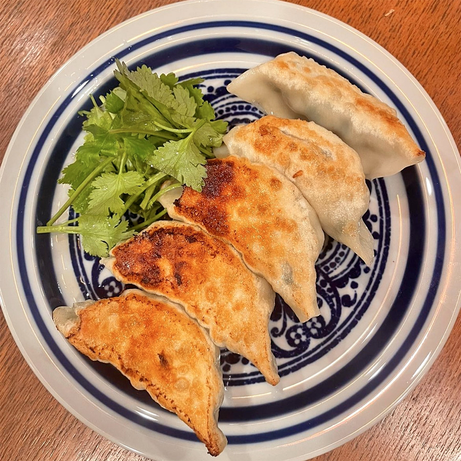 通常の焼餃子にはパクチーが添えられています。