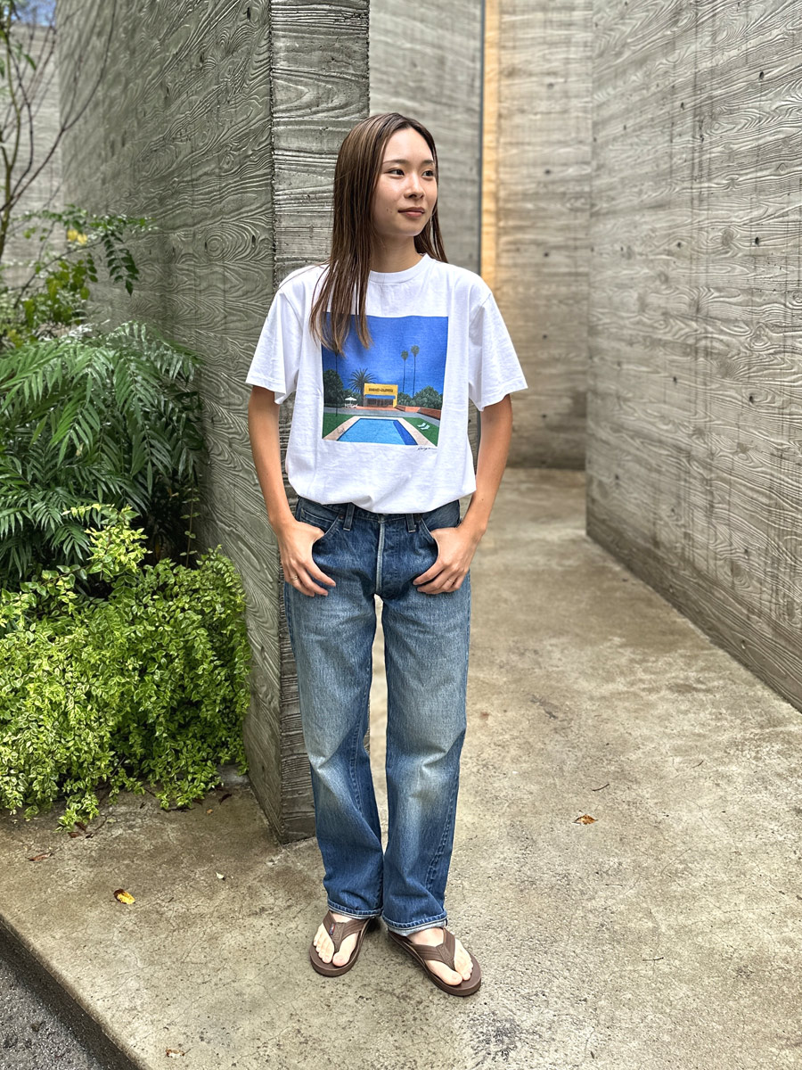 ボトムスはショーツか迷いましたが今回は古着のライトブルーのLevi’sにして足元はRainbow Sandalsでまとめました。
