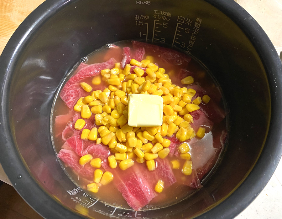 材料を準備し、炊飯器に入れて炊くだけ。なんとも簡単です。