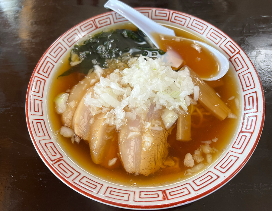 醤油ダレを使ったスープ、薬味に角切りの玉ねぎ、大ぶりチャーシューを入れたものが特徴的なラーメン。