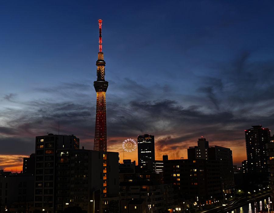 まだまだ明るさも残りますが、夕焼け空とスカイツリーを望む絶景の中、見えました花火~!!