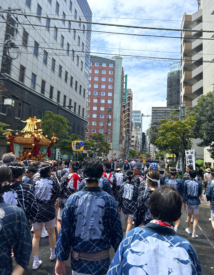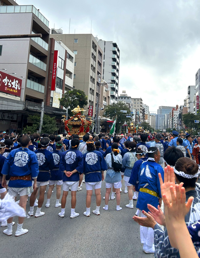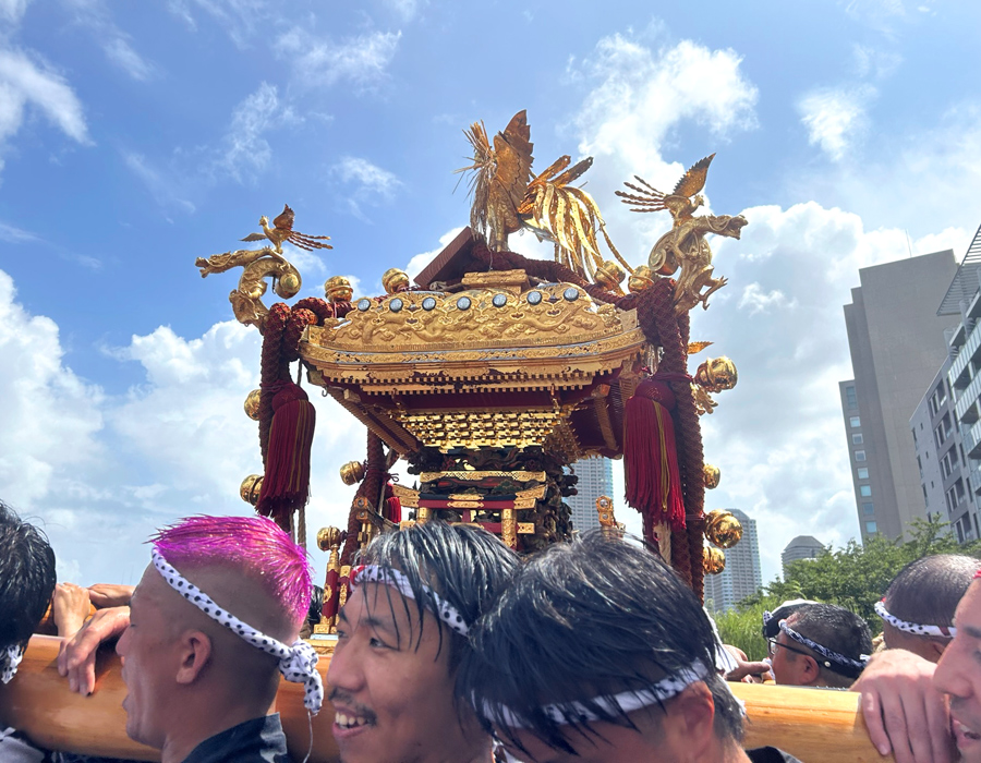 永代橋を渡るときの1枚。日が差すと神輿がすごく輝いて見えますね!