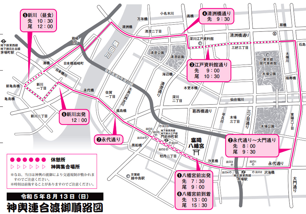 各町会が朝から神輿を担ぎ、⑦の永代通りに運び2列に並びます。