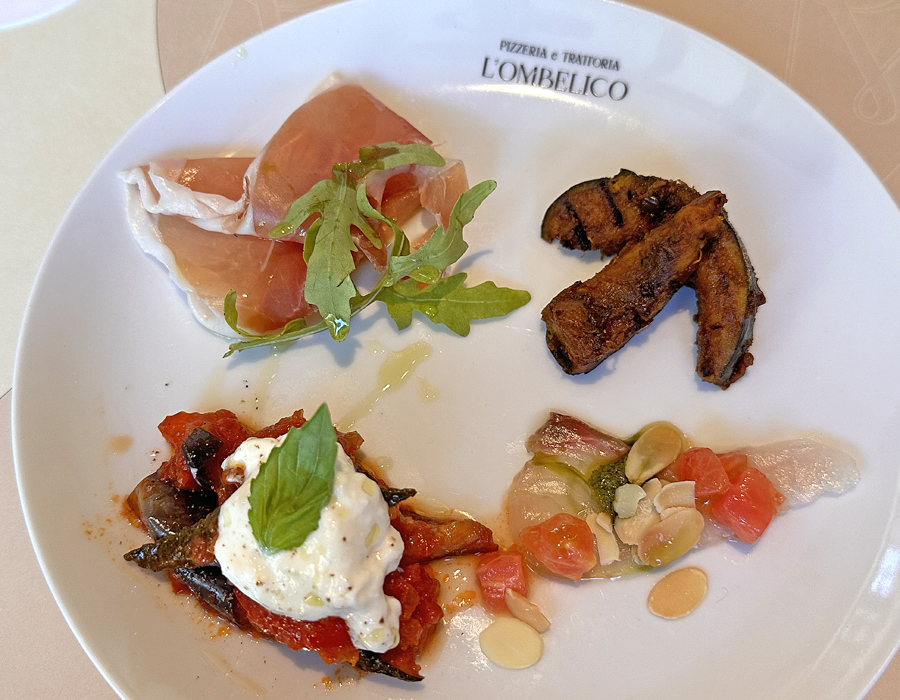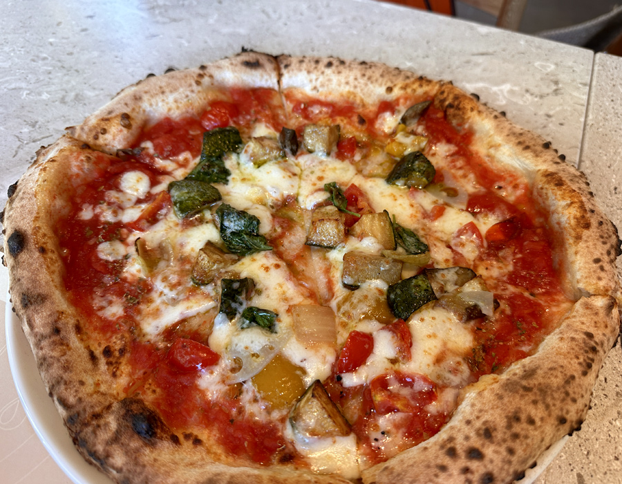 モッツァレラ、ペリコーノチーズにズッキーニ、ナス、パプリカ、季節野菜、バジリコがのったトマトベース。