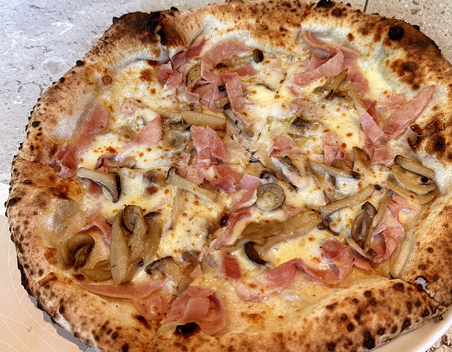 ハム、マッシュルーム、スモークモッツァレラ、ペコリーノチーズがのっています。