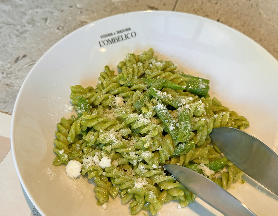 ジェノベーゼが練り込んであるパスタは、ソースと良く絡むらせん状のフジッリ。