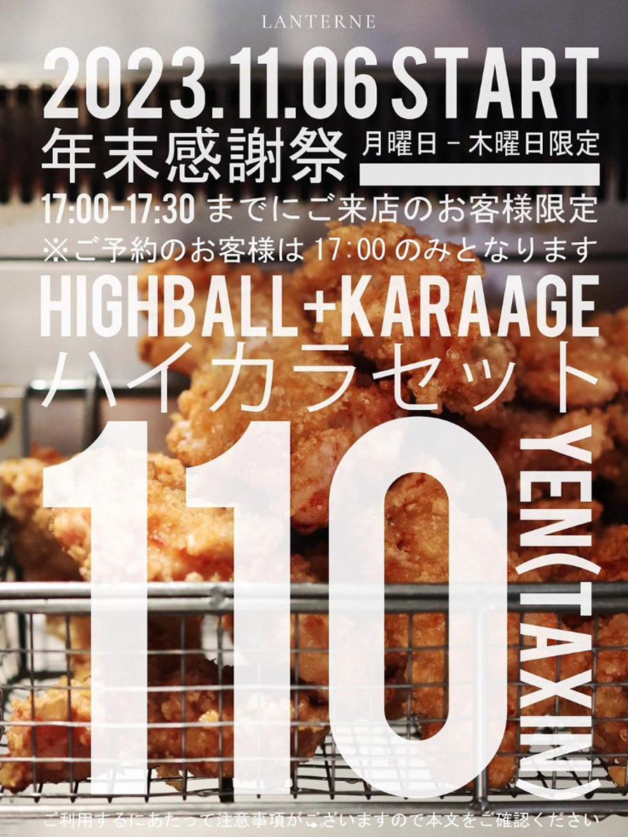 大ぶりでジューシーな唐揚げ2個とハイボールがセットになって、なんと110yen!!