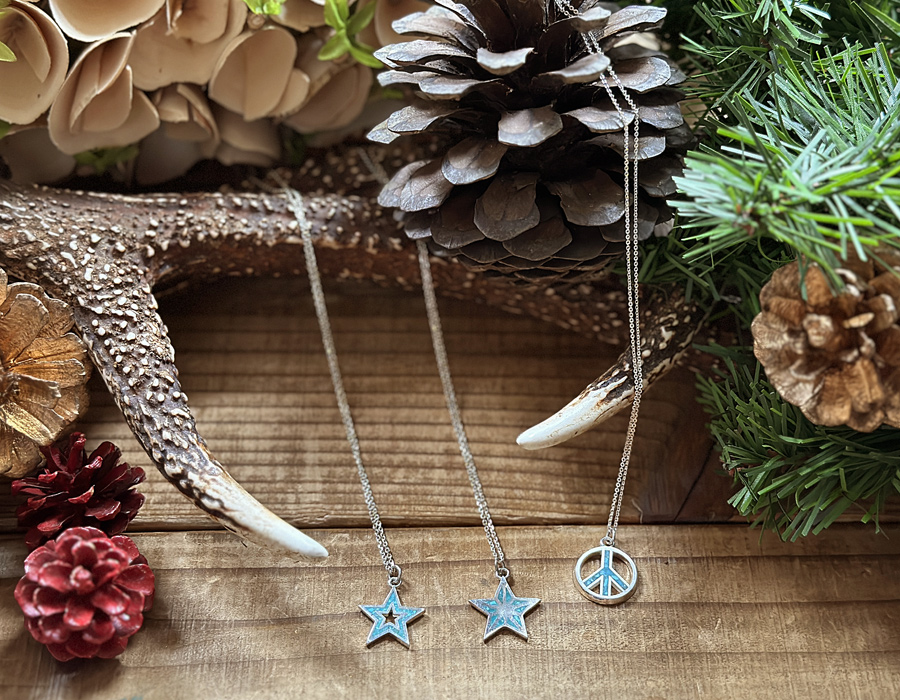 自らキングマンターコイズ(アリゾナ州キングマンで採れるターコイズ)を砕き、1点1点作り上げています。