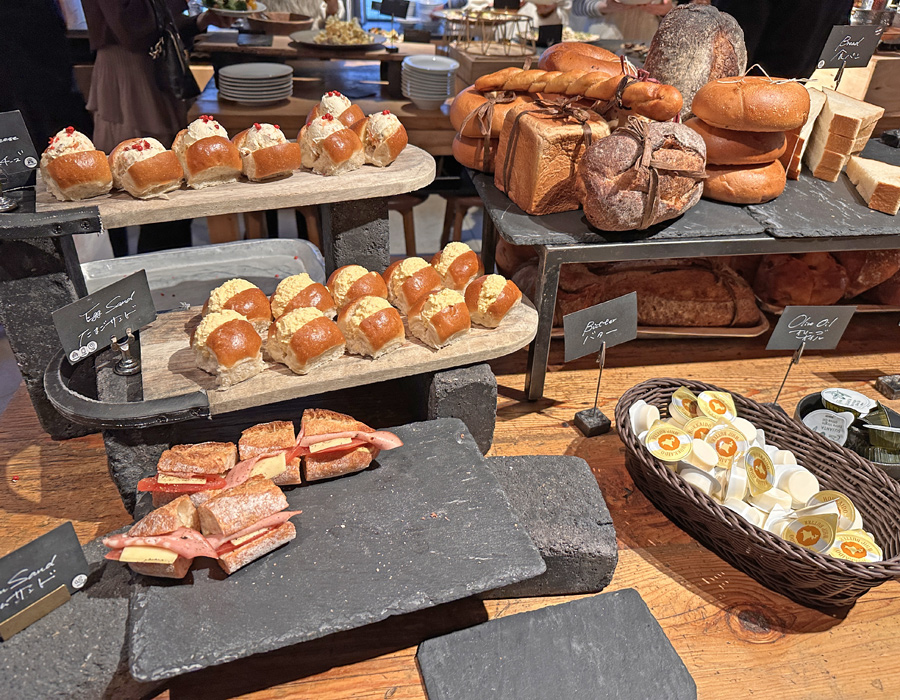 左にパン、右にサラダ、奥にはタパス、窓際にはデザートまで揃っています。