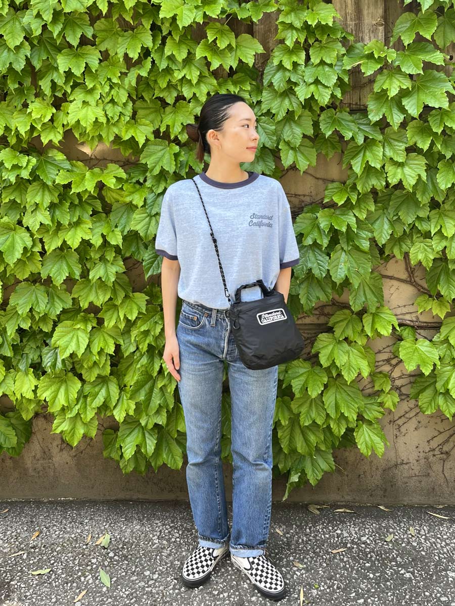 トップスは身幅もあり、ややゆったり目なので、ボトムは色の抜けた細身の古着デニムで合わせました。