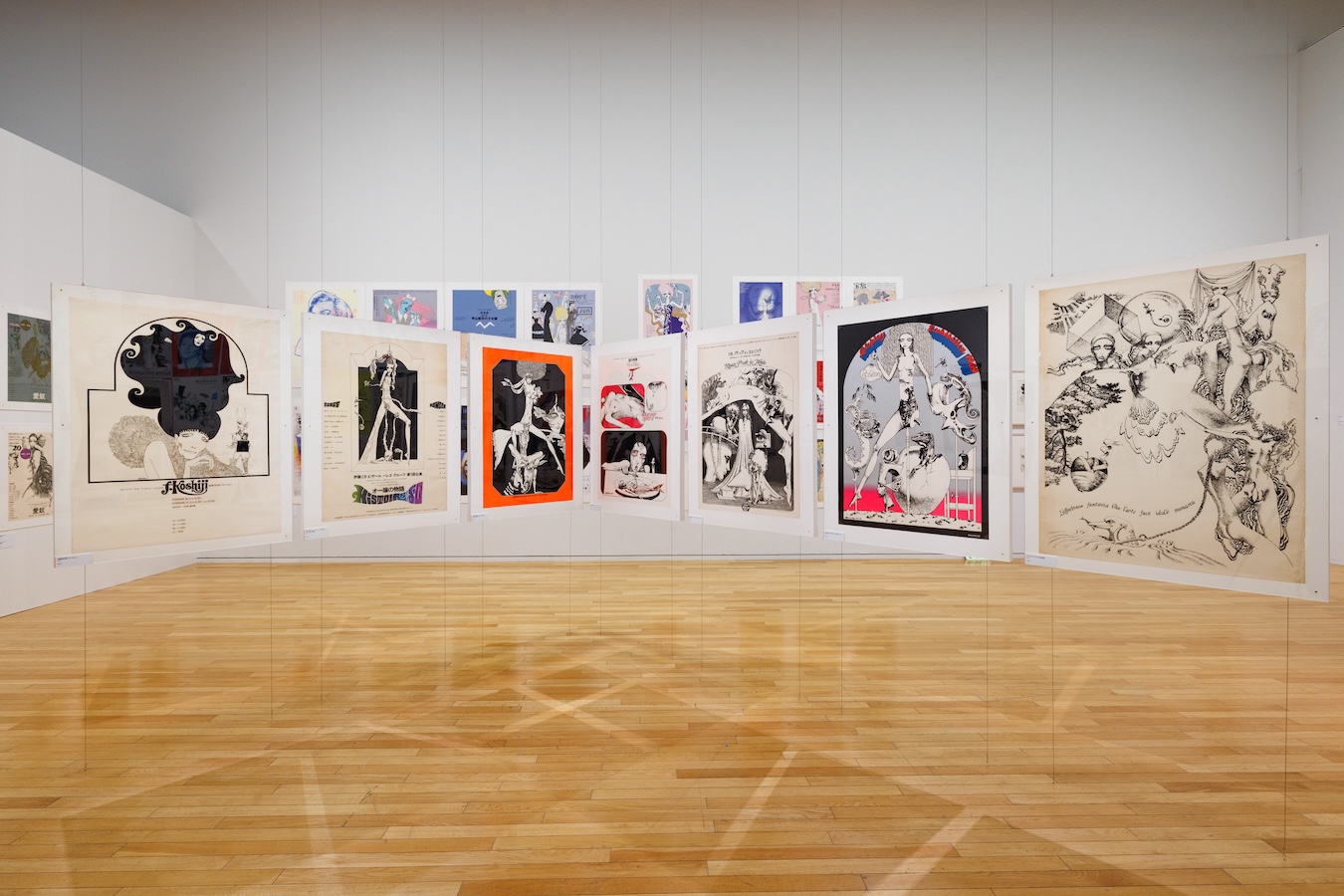 寺山修司の演劇ポスターや布袋寅安、TOSHIのビジュアルポスターなど。